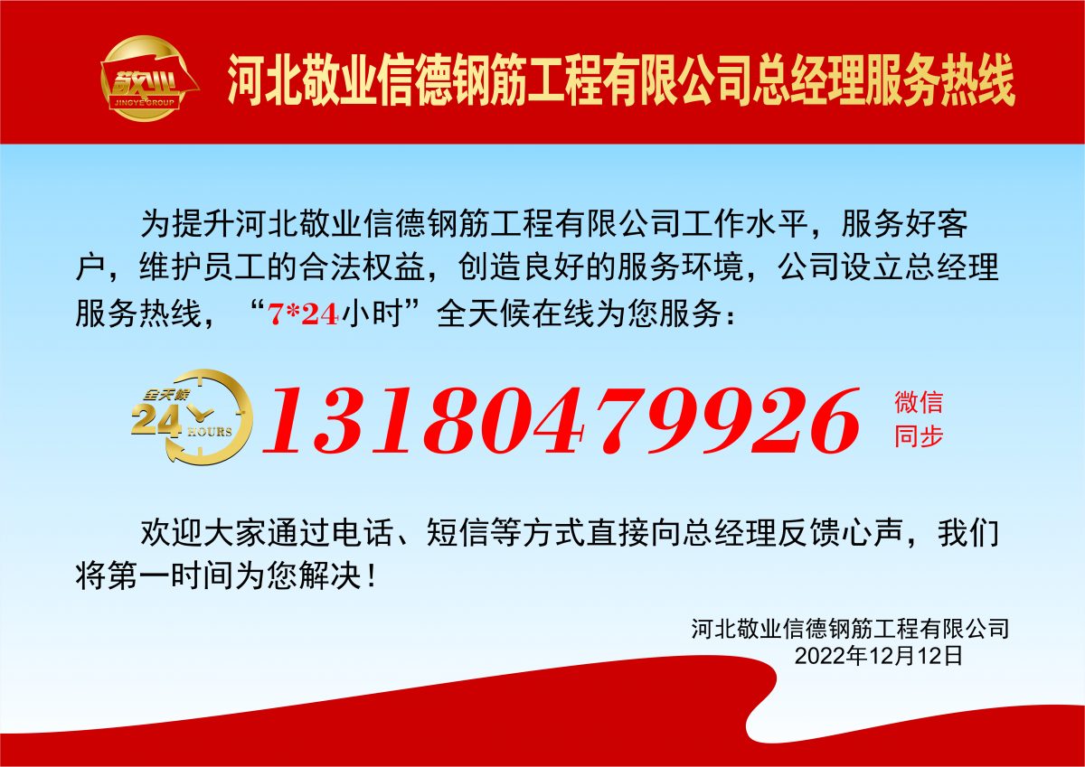 河北敬業(yè)信德鋼筋工程有限公司總經(jīng)理服務(wù)熱線 為提升信德公司工作水平,服務(wù)好客戶,維護(hù)員工的合法權(quán)益,創(chuàng)造良好的服務(wù)環(huán)境,公司特設(shè)總經(jīng)理服務(wù)熱線,“7*24小時(shí)”全天候在線為您服務(wù):13180479926(微信同步) 歡迎大家通過電話、短信、等方式直接向總經(jīng)理反饋心聲,我們將第一時(shí)間為您解決! 閱讀量 2,175 Category: 公司新聞2023年4月28日Post navigationPreviousPrevious post:敬業(yè)集團(tuán)表彰一季度“五好先進(jìn)單位”NextNext post:敬業(yè)鋼鐵參建的“雄安之眼”城市計(jì)算中心嶄新亮相!相關(guān)文章信德公司成功舉辦2025年“安全月”演講比賽2025年6月27日信德鋼筋迎來國際考察團(tuán),初步達(dá)成后續(xù)訂單合作意向2025年6月27日信德鋼筋以實(shí)力贏得雄安微振動(dòng)試驗(yàn)室項(xiàng)目合作2025年6月18日河北敬業(yè)信德鋼筋工程有限公司榮獲“京津冀優(yōu)質(zhì)加工企業(yè)(京津冀)”榮譽(yù)2025年6月6日